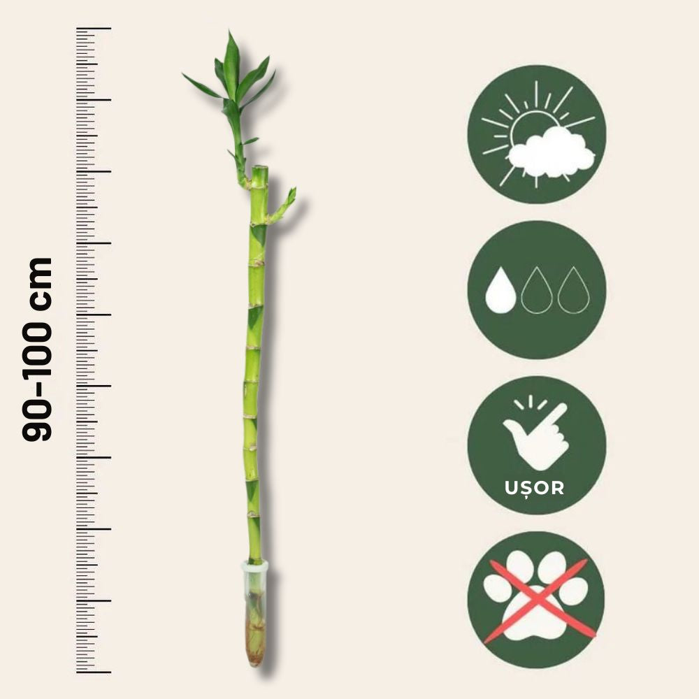 Aceasta planta exotica este asociata cu feng shui-ul, fiind cunoscuta pentru a aduce noroc, prosperitate si energie pozitiva in casa. Bambusul Ondulat Lucky creste cel mai bine in apa, cu tulpinile pozitionate intr-un recipient transparent, astfel incat sa poata fi admirate. Este important sa schimbati apa o data la 2 saptamani si sa mentineti un nivel constant de apa pentru a asigura o crestere sanatoasa. Bambusul Lucky nu necesita multa ingrijire, fiind o planta rezistenta si usor de intretinut.