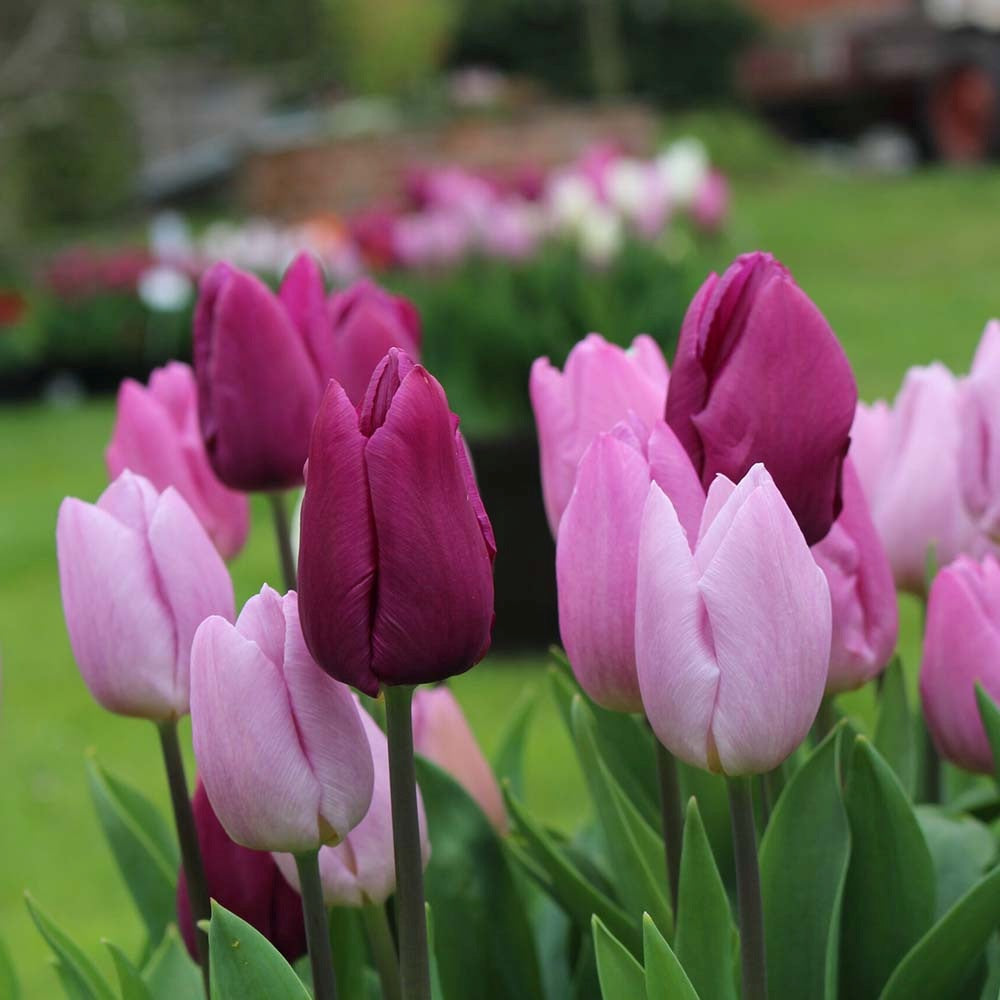 Florile apar in aprilie – mai, fiind printre cele mai timpurii varietati care aduc culoare in gradina. Petalele sunt netede, cerate, cu forma clasica de cupa, iar tulpinile drepte si rezistente le sustin cu eleganta. Culorile sunt armonios contrastante – roz pastel si mov violet profund – oferind un efect vizual calm si sofisticat. Lalelele din acest mix sunt excelente atat pentru straturi florale, borduri, cat si pentru aranjamente florale sau buchete proaspete.