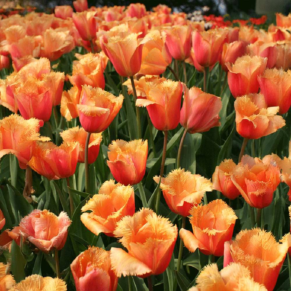 Bulbi Lalele Lambada, set 7 buc cu flori portocaliu-somon cu margini dantelate, inflorire aprilie, ideali pentru borduri si flori taiate
