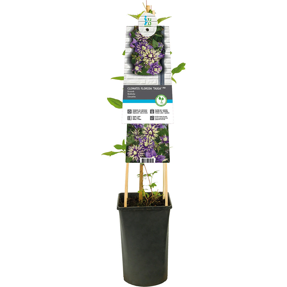 Clematis 'Taiga' este o planta cataratoare de o frumusete rara, cu flori spectaculoase care aduc un aer exotic oricarui gradinar pasionat. Florile sale impresionante duble, violet inchis cu petale franjurate si aspect multi-stratificat, sunt asemanatoare cu cele ale unei flori de pasiune, transformand-o intr-un punct focal uluitor in orice gradina. Petalele interioare au varfurile de culoare crem spre verde deschis.