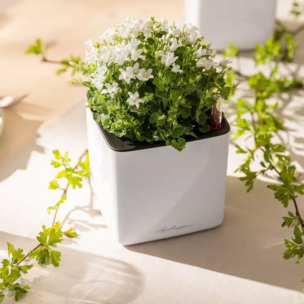 Ghiveci Auto-Irigant Lechuza Cube Glossy 14, alb lucios, pentru plante cu ghiveci, sistem de autoirigare, insert detasabil, strat de drenaj