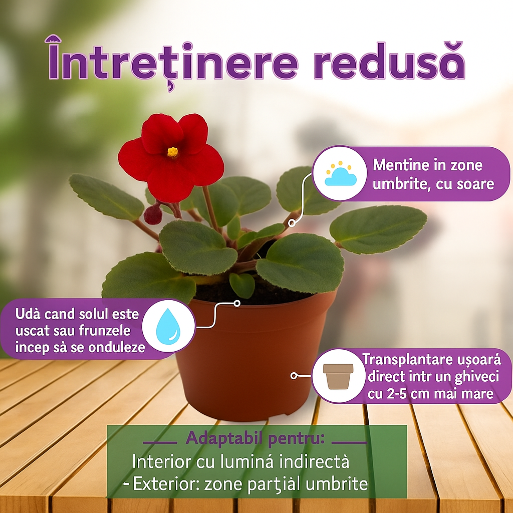 Saintpaulia More Lips Red infloreste pe tot parcursul anului, cu perioade de inflorire mai intense primavara si vara, aducand prospetime si energie spatiului tau interior. Nu este recomandat sa fie scoasa afara in timpul verii, deoarece curentii si diferentele de temperatura ii pot afecta frunzele si florile. Planta are proprietati de purificare a aerului, contribuind la imbunatatirea calitatii aerului din casa si la crearea unui mediu mai sanatos.