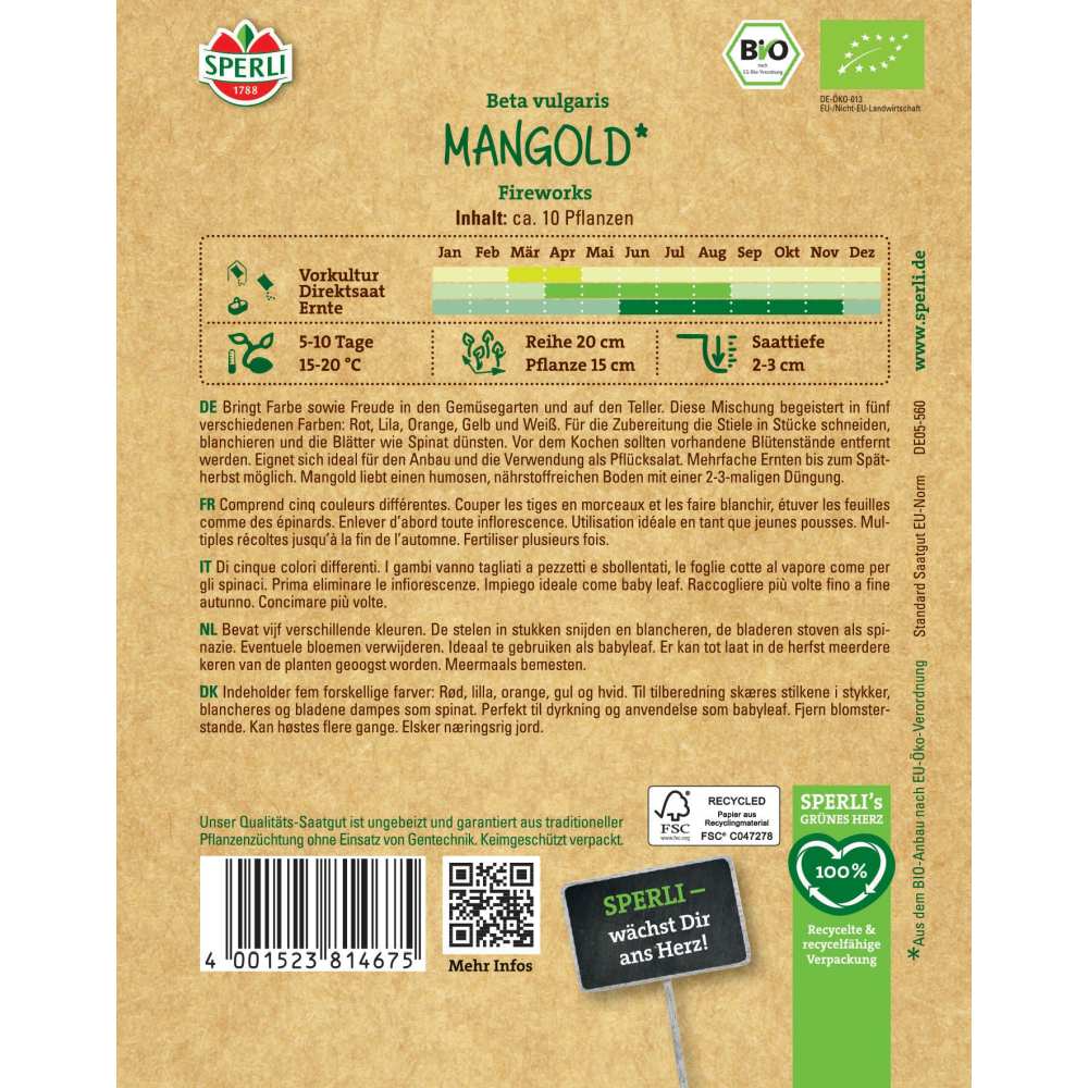 Mangoldul BIO Fireworks de la SPERLI aduce un spectacol de culoare si sanatate in gradina ta! Tulpinile viu colorate in rosu, violet, galben, portocaliu si alb transforma orice strat de legume intr-un decor vibrant. Acest soi este ideal atat pentru frunzele tinere (baby leaf), cat si pentru recolte successive pana toamna tarziu.