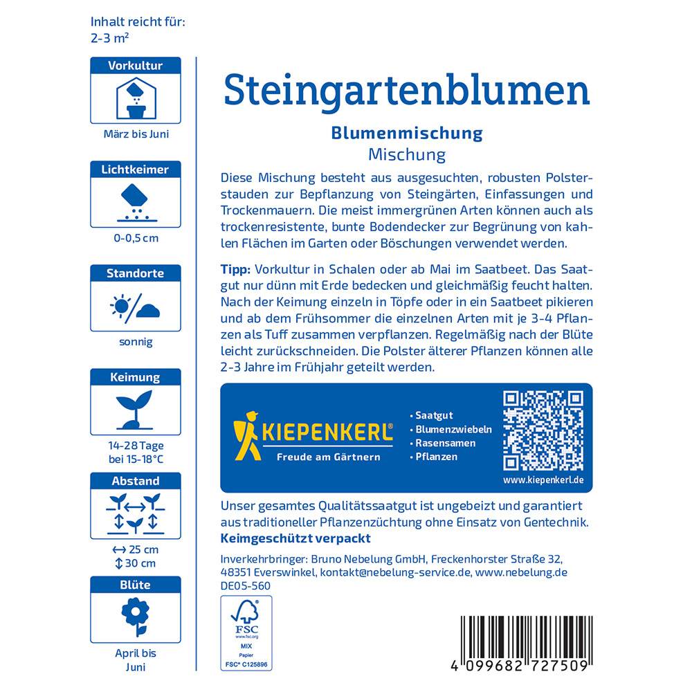 Amestecul de flori pentru gradina de piatra este special creat pentru zone dificile, unde alte plante se dezvolta greu. Include polsterstauden (plante perene de tip perna), robuste si adesea vesnic verzi, care se adapteaza excelent in stancarii, pe pante, intre pietre sau pe ziduri uscate.