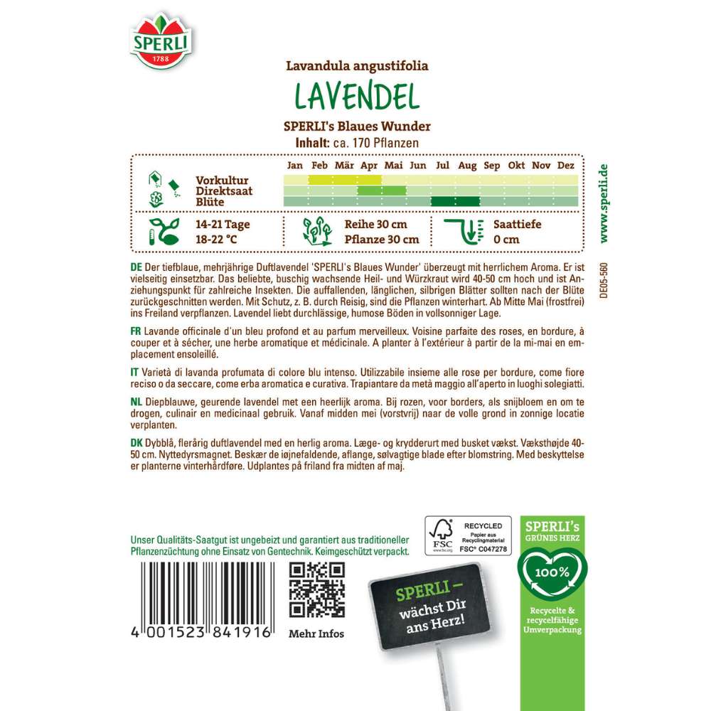 Lavanda SPERLI Blaues Wunder este o varietate perena de lavanda cu inflorire bogata si parfum intens, care aduce un plus de eleganta si liniste oricarei gradini. Spicele violet sunt pline cu flori parfumate ce pot fi recoltate pentru perne aromatice, aranjamente uscate sau bai relaxante cu efect calmant. Planta are un obicei de crestere compact, atingand 40-50 cm la maturitate.