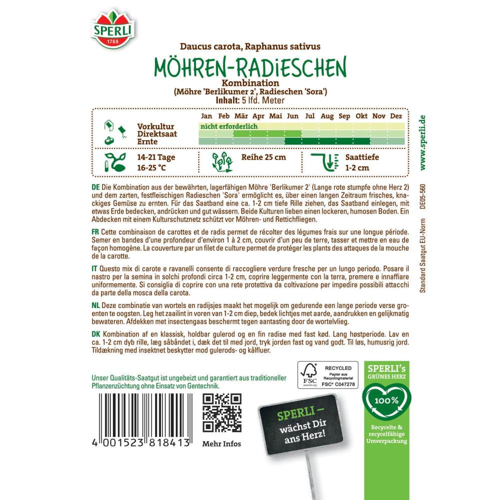 Acest mix cu banda de seminte SPERLI este perfect pentru cei care doresc sa cultive rapid si eficient doua legume populare: morcovul si ridichea. Banda contine semintele soiurilor 'Lange rote stumpfe ohne Herz 2' – un morcov cilindric, fara miez, ideal pentru depozitare si bogat in beta-caroten – si 'Sora', o ridiche rosie timpurie, crocanta si gustoasa.