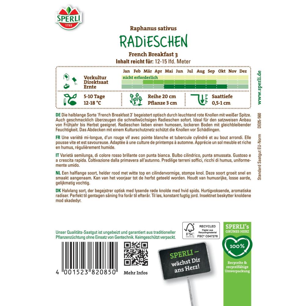 Ridichea 'French Breakfast 3' este o varietate traditionala cu maturare rapida si gust usor picant, foarte populara pentru cultura de vara. Radacinile sunt cilindrice, cu coaja rosie si varf alb, si ofera un contrast vizual placut in salate si preparate reci.