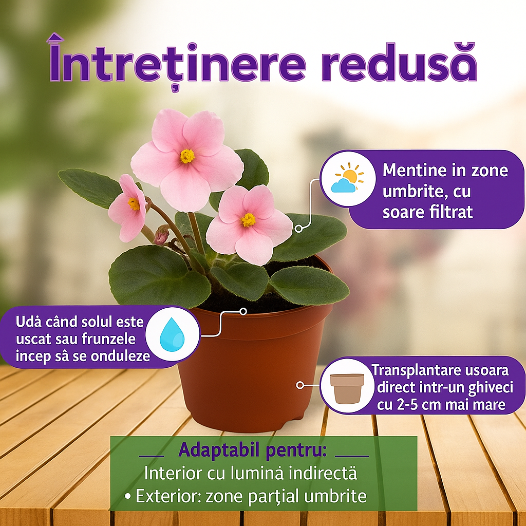 Saintpaulia More Lips infloreste in mod repetat, cu infloriri spectaculoase primavara si vara, colorand cu eleganta locuinta ta. Nu este recomandat sa fie scoasa afara in timpul verii, pentru a evita fluctuatiile de temperatura.